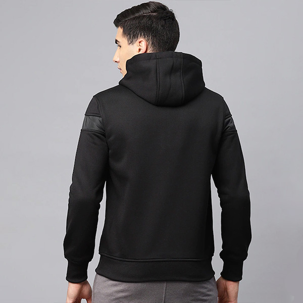 Black solid bomber, has a hooded, two pockets, zip closure, long sleeves, straight hem, polyester lining