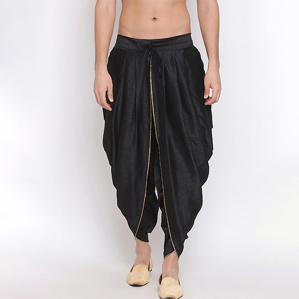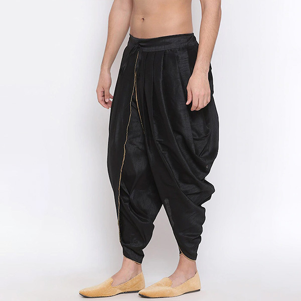 Black solid ready to wear mid-rise dhoti with gold-coloured border, has a waistband with a drawstring fastening and pleats on side