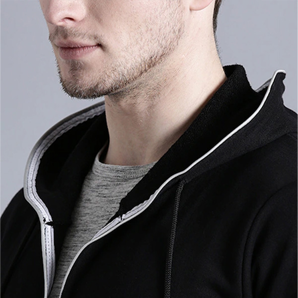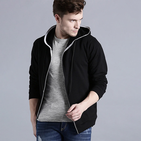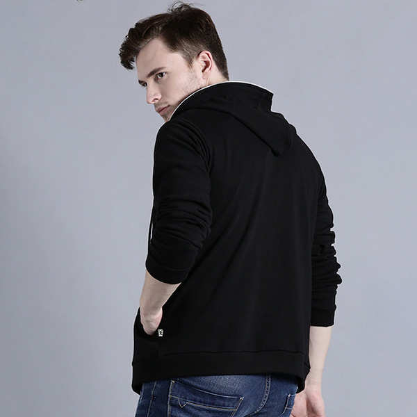 Black solid sweatshirt, has a hood with a drawstring fastening, 2 pockets, long sleeves, straight hem