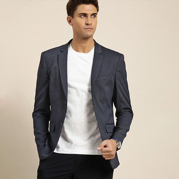 Men Navy Blue Slim Fit Self Design Smart Casual Blazer