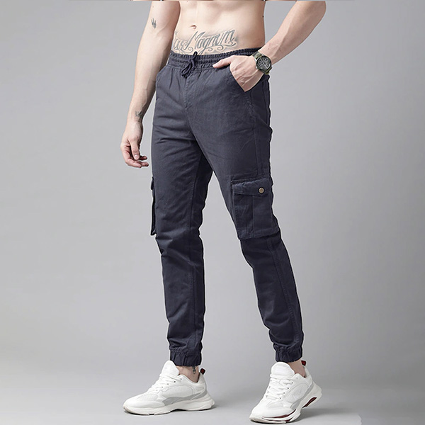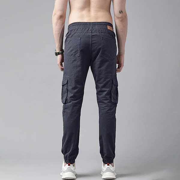 Men Navy Blue Solid Mid-Rise Woven Pure Cotten Cargo Trousers