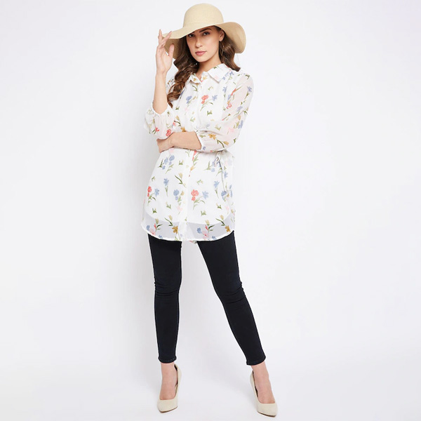 White and blue printed tunic ,has a shirt collar, three-quarter sleeves, tie-ups detail, button closure
