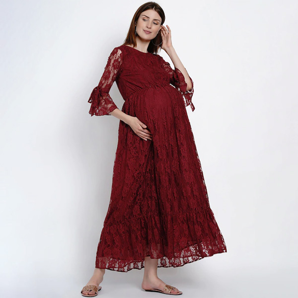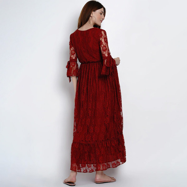 Maroon self-design knitted and woven maxi dress, has a round neck, three-quarter sleeves, zip closure, an attached lining, and flared hem